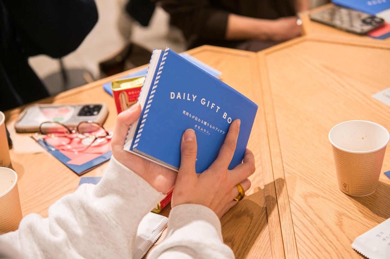 「今日はみんなでざっくばらんに話したい」と参加者に話しかけ、和気あいあいとした雰囲気のなかで始まったオモムロニ。さんのトーク&座談会。ギフト選びのアイデアが詰まった著書『DAILY GIFT BOOK 気持ちが伝わる贈りものアイデア』を片手に、次々にギフト選びのヒントが紹介されていきました。